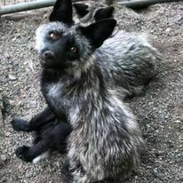 Jasper and Jinx are our two young silver foxes, a melanistic variation of the red fox that displays wild pelt variations from pure black to blue-grey, or silver spotted. These two came to Cat Tales in early June 2019. Beyond learning to be good brothers to one another, they have also become fond of their neighboring fox kits Trixie and Todd. But most of all they enjoy being together no matter the weather, time, or event. Jinx is almost purely silver, a shining fox who spends most of his day curled up napping or ‘gekkering’ (a sharp, barking sound) at nothing in particular. (Jinx also has a genetic deformity in his front legs, though it does not affect his behavior.) His brother, Jasper, is more curious about the world and will watch staff and guests alike. He is also not as silver as his brother, with quite a few patches of black across his fur. Born April 15, 2019.