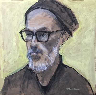 Sean may have been the easiest and certainly one of the most fun people to paint. For me, at least, any time someone gives me something more than their simple face, I usually have so much more to work with. Sean gave me all kinds of points of reference on his face — his beard, his mustache, his glasses, and his hat. It didn’t hurt that he was interesting to talk to as well. Early on in this project, I kinda ran up against a built-in contradiction to the composition of a pizza box. The boxes are square and faces are oval. Faces don’t usually belong in square frames. And when they do, what do you do with all that empty background? Early on, I guess I just thought that it would be interesting to color it for the moment. And then I used that solid color solution for many of the paintings that followed.