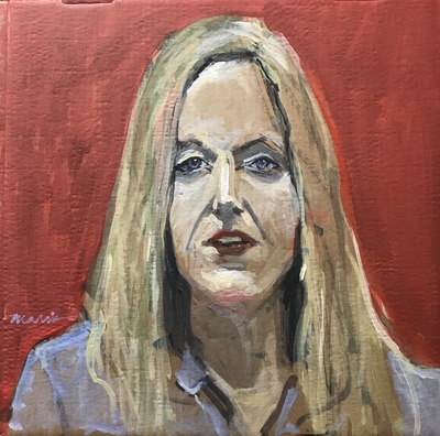 Nicole was a serious portrait sitter and a serious fan of pizza. She read into this whole pizza box portrait thing far more deeply than I ever could have imagined. She even wore her pizza socks to her portrait session. All kidding aside, her dad worked in a pizzeria as she grew up, so pizza was in her blood, so to speak. She was so excited for her portrait that she told her colleagues at work she was going to get painted on a pizza box and they wished her good luck as the new Mona Pizza. She was lots of fun to paint and chat with, as were most all the portrait sitters for this project.