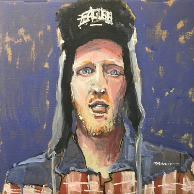 Before we talk about Wesley, a word about my cousin, Rosemarie. Because I have liked art all my life, my more conservative cousin, Rosemarie, likes to call me a hipster doofus, ala Cosmo Kramer in Seinfeld. I love this. I take it as a badge of honor that I would be called a hipster doofus, so I put out a call for portraits for hipster doofuses. Wesley’s wife, bless her heart, nominated Wesley to be painted, and he, the great sport that he is, went along for the ride. Wes donned his Philadelphia Eagles pullover cap and wore his super special shirt for the occasion. I just remember laughing a lot with him and having a great time painting him. He was also the 30th portrait that I painted and that felt like a nice achievement at the time.