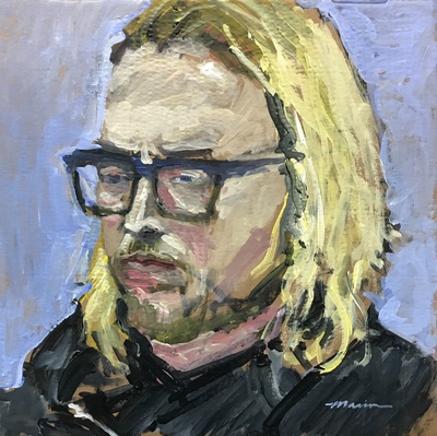Ted and I have been sketching together for years. Primarily at the Society of Illustrators in Manhattan, but later on we’ve gotten together just to sketch each other for fun. Ted is a good friend. On this occasion, Ted was visiting Philadelphia from his full-time illustration teaching position at SCAD, the Savannah College of Art & Design. We spent a couple of days in town hitting some good restaurants and then realized we were running out of time to paint each other. With about an hour left before he had to be at the airport, we hit my studio and had a one hour rush session to paint each other’s portrait. I was able to get one painting off in the hour. Ted sketched and painted me twice!