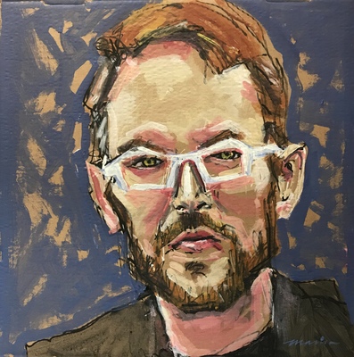 And, of course, Kurt, Christine’s husband, I painted next. I loved my time with Christine and Kurt observing the affection they have for each other. Christine is both a sibling to Sean (who I painted early on in the project) and a partner to Kurt. Kurt & Christine were the first of several partners I have painted for the project. And while all sets of partners were painted individually on their own pizza box, it was great to spend time around people who care so much for each other.