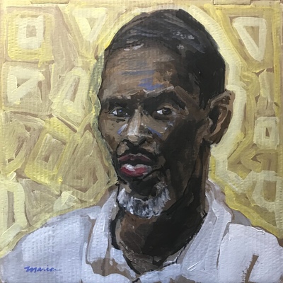 Curtis volunteered to sit for a portrait and I am so glad that he did. In Curtis’s portrait, I wanted a yellowish background and I just started blocking in some color when I realized I liked the patterns I was making so I decided not to fill in the background uniformly. As Curtis observed, he felt he looked like an African prince and I couldn’t agree more. In talking with him, he told me his middle name is Leroy, which, of course, is derived from LeRoy, or the King. How fitting Curtis Leroy should feel his is depicted as royalty.