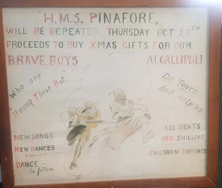 One of these, was the production of, ‘H.M.S. Pinafore’. The concert was to raise funds for gifts for ‘our wounded men and boys’. All of Harold’s sisters, Minna, Dorothy and Flora starred in this production, and one of them drew the poster to advertise the event.