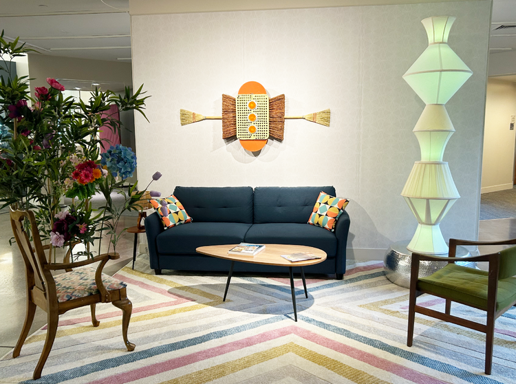 Hello, this is Deborah Jang. Thank you for visiting my show, SUM OF THE PARTS. Welcome to the Conversation Corner of the gallery. This is an immersive living room scene that includes three of my assemblage sculptures, all made from repurposed objects. THE SHAPE OF LIGHT is a 9-foot tower composed of lampshades, mostly found in thrift stores and yard sales, and also incorporating LED "mood" lighting. FISH STORY is a wall-sculpture from my over-the-sofa series. It is built from brooms and wood salvage. SIT.STAY.BREATHE is a recent addition to my chair sculpture collection. You are welcome to sit -- plant yourself and become part of the sculpture. Feel free to take and post photos of yourself or friends in this immersive installation and, if you do, I would love to see you. You can tag me @deborahjang. Also, you are invited on November 5, from 5:30 to 6:60, when two other poets, Suzi Q Smith and Shymala Dason, and I will be reading from this space.