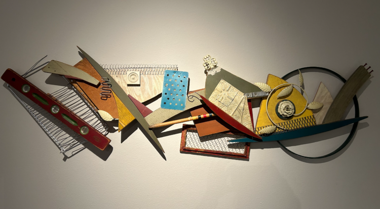 This is Deborah Jang. Thank you for visiting my show, SUM OF THE PARTS. Several of my long horizontally formatted sculptures comprise this playfully-titled OVER THE SOFA series, which poses the question: Do you choose art that matches your furniture or furniture that matches your art? Each of these wall-mounted pieces incorporates random components -- miscellanea collected from anywhere and everywhere -- brought together and juxtaposed in unexpected arrangements where they play off one another, offer intrigue or evoke nostalgia, and take on a new sense of belonging within the composition. Some of the parts you may recognize in these sculptures include embroidery hoops, a street sign, fan blades, oars, furniture parts, brooms, shutters, reflector lights, an abacus, metal doodads, and wooden knick-knacks. The piece CONUNDRUMIUM evolved from several smaller works into a nonsensical playful puzzle. ROW was named for its unruly attempt at a straight line, and for the oar, one of its many random objects. CAMINO DEL CORAZON was built during Covid when we were "shuttered in." Somehow the camino del corazon street sign took on extra special significance during that time. REMAINS OF THE DAY is another far-ranging array of forms, textures, and materials finding second lives. And FISH STORY is one of my rare symmetrical compositions, placed in the Conversation Corner of the gallery, right over the sofa