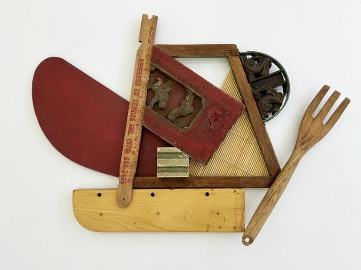 This is Deborah Jang. Thank you for visiting my show, SUM OF THE PARTS. POETRY IN MOTION was a larger collection of wall-mounted work, and these are samples from that series. You will recognize common parts that the sculptures share: from old game boards and game parts, ceiling fan blades, embroidery hoops, and miscellaneous wood forms, signage, and metal household items. You may detect a couple of nautical references in these pieces, and within the entire show as well. I designed most of these smaller sculptures so that they can be displayed in multiple orientations. They can stand alone or in combination with others in the series. I like to think that the sculptures converse with one another, creating an overall visual and playful resonance.