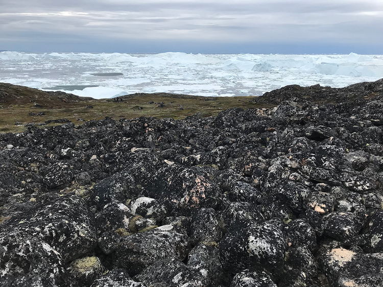 Vi står her i et tilsyneladende urørt fjeldlandskab. Men når man kigger nærmere efter vil man kunne se, at der er hentet mange sten hertil og derefter er de lagt i bestemte formationer. Dette er Inuits gamle gravplads......