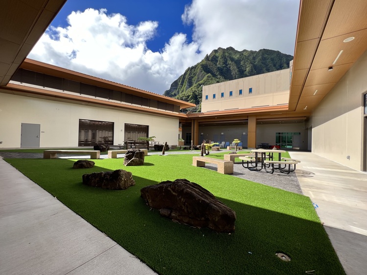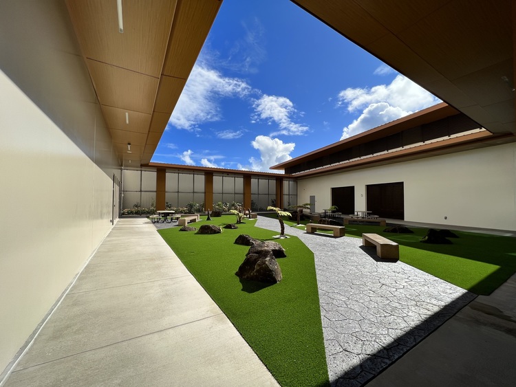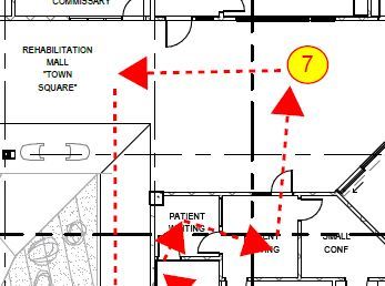 Stop 7 is the Rehab Mall Town Square. You will see the patient commissary to the right as well as patient restrooms and a Music Therapy room further down the corridor. To your left is Central Park, as relaxation area for patients. Please make a left and continue down the corridor to the Chapel, then around Central Park. This will take you to Stop 8, the Gymnasium.