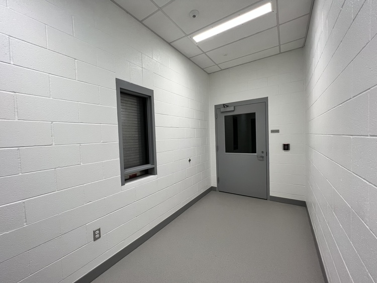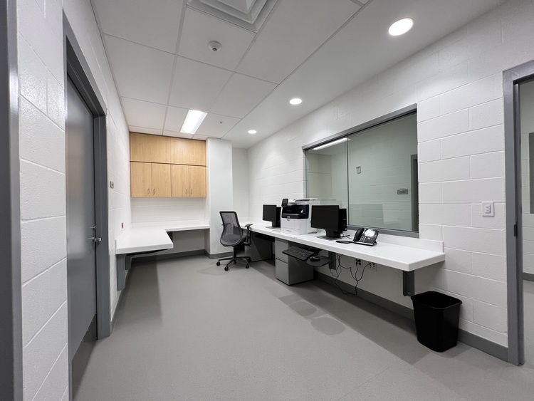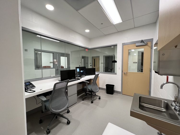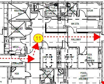 Stop 11 Sick Call Corridor. Upon entering the Sick Call Corridor, you will see the Meds room to the left directly followed by 2 Restraint rooms. Directly in front of you there is a patient shower/restroom, followed by a staff work area. Across from the staff work area are 2 sick bay rooms and an exam room. Once you have had a chance to look around, please proceed to the secured door at the end of the hallway and press security button to continue to Stop 12.