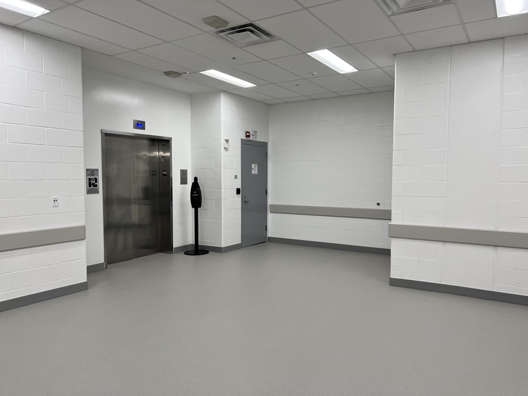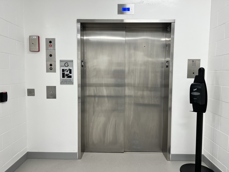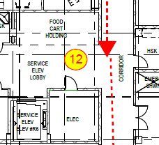Stop 12 is the Service Elevator Lobby. Food Cart Holding is to your right with the service elevator to your left The service elevator is for transportation of patient meals to the units and clean and soiled linen and trash. Please continue to Stop 13, press button to get through the security door.