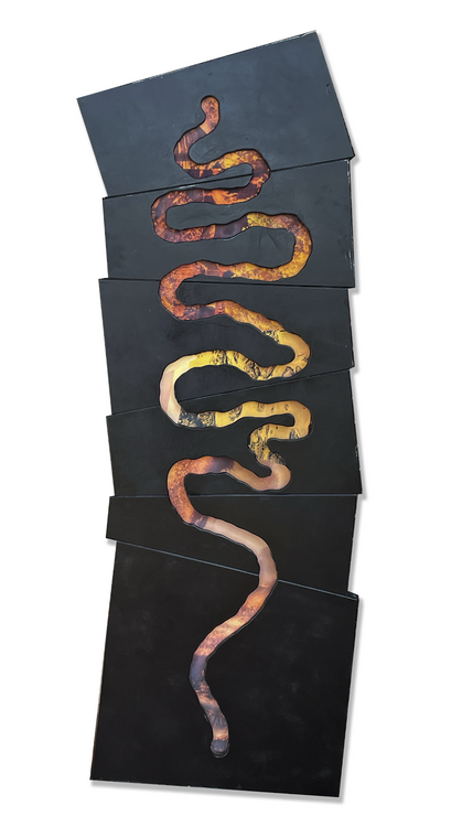 I took those slices and I rearranged and assembled them into a stack that I liked, that I felt held a sort of precarious balance. I assembled them, firmed them up, gave them a new backing, and then I cut through that new surface of the stacked panel and I cut a winding line into the surface to reveal a collage that I created behind it.