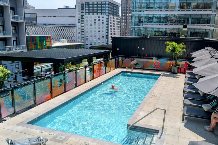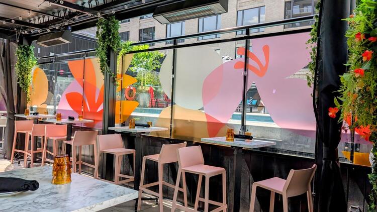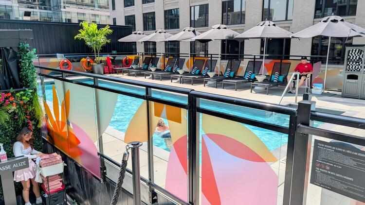 Les tons monochromes de mandarine, rehaussés de motifs floraux, insufflent à l’espace une énergie ludique et lumineuse, pensée pour s’harmoniser avec l’ambiance vibrante et décontractée du cadre de la piscine.
