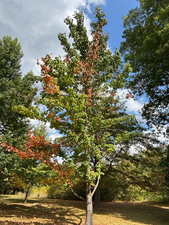 Here we have the Black Maple, or Acer nigrum. Though less common than the closely related Sugar Maple, it occurs throughout the Midwest. This large tree often reaches heights of 80 feet and can live for 400 years or more. Preferring moist sites, the Black Maple is frequently found along streams and river bottoms. Its dark green, five-lobed leaves closely resemble those of the Sugar Maple but always appear drooping, regardless of water needs. The Black Maple produces samaras, or paired, winged seeds, which turn from bright green to brown as they ripen in the fall. The mature bark is tannish-gray with vertical ridges that run up and down the tree in no particular pattern, often curling along one side.