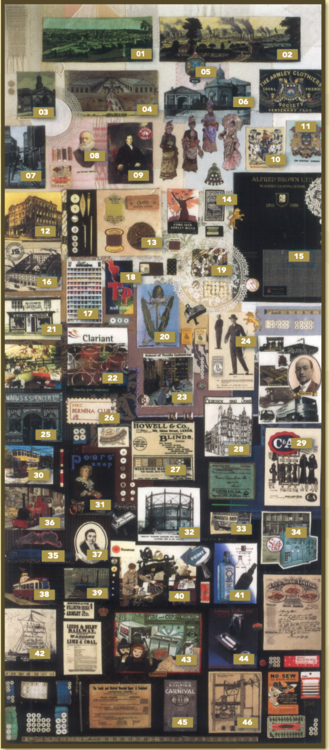 On the right, an old advertisement for C & A clothes is displayed, a European brand that operated in the UK from the 1920s until the early 2000s. To the left and slightly above, a Peacock’s store is depicted, representing the early 19th-century textile company known for curtains, bedding, and carpets. This section was embroidered by Mary Mawson, who once worked at Peacock’s and remembers them fondly. Below Peacock’s, a blue gin bottle made by Lax & Shaw, a Leeds glass company established in the 1890s, is shown. Once known for baby bottles, Lax & Shaw later specialized in colored glassware like the Sapphire gin bottle.