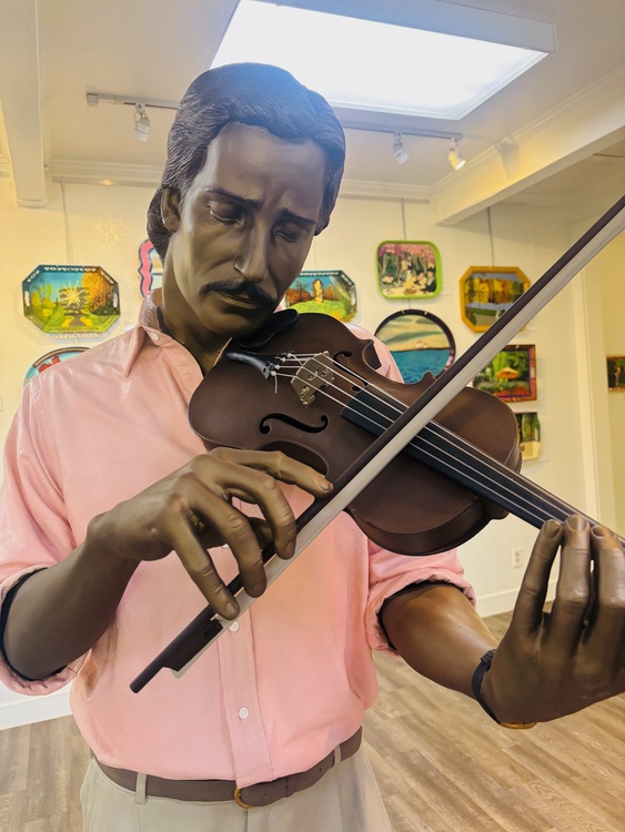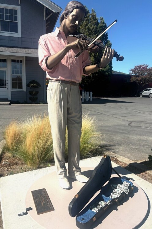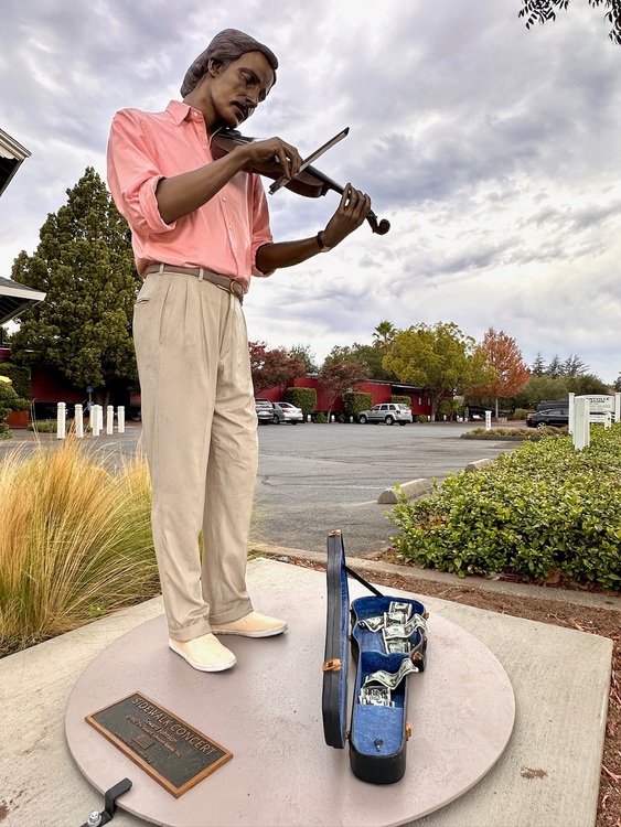 "Sidewalk Concert" is a lifesize sculpture created by world renowned artist Seward Johnson. His work is exhibited internationally and included in numerous private collections, museums and public art collections. Yountville Arts partnered with The Johnson Atelier for a very special show titled: "Seward Johnson: Midnight Snack Trays" during this last summer.