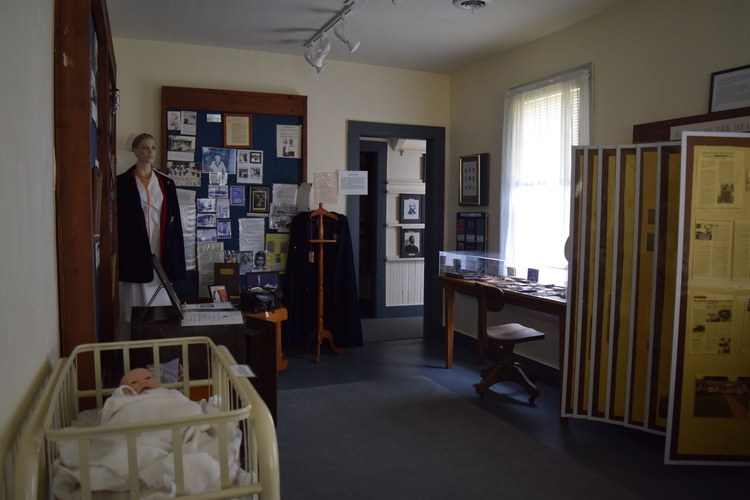 This room was home to two or three beds for women to recover from surgery. Due to lack of room it is now used to display different items. The one wall is an honor of the nurse and the many duites she was called on to preform. There is a photo display of nurses from a variety of places. There is a nurse in authentic uniform including her cap pin and cape donated by a nurse from Lincoln, Arkansas. There is aslo a wall of pictures of area hospitals. The safe was used for narcotics at the Elizabeth Hospital in Prairie Grove.