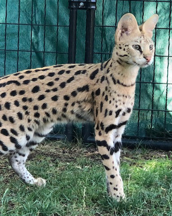 Ginger is a young female Serval who came to Cat Tales when her former owner could no longer keep her. She was moving to an area where ownership of exotic cats is illegal. Ginger was released to us for care with Ozzy. Ginger and Ozzy are not compatible as Ozzy attempted to kill Ginger when she was a kitten and they both remember the trauma. Along with injuries sustained in the attack, Ginger was very sick upon arrival and required months of intensive care to maintain quality health. Ginger has grown into a beautiful, typically hissy Serval. Her pink nose indicates she may have domestic cat in her genetics. Born May 23, 2020.