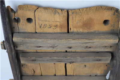 Thomas Waber tenía 14 años y vivía en el condado de Van Buren, Michigan, cuando un herrero forjó las correderas de este trineo. Se utilizaron clavos forjados a mano en la construcción de su base de madera, una tarea que Thomas o su padre, John, pueden haber completado ellos mismos. Para propulsar este trineo, llamado scooter, uno se arrodillaba sobre él y empujaba hacia adelante usando palos. La familia Waber llegó a los Estados Unidos desde Alemania en 1848 y llegó al condado de Van Buren en 1855. John compró 80 acres de tierra que él y su hijo cultivaban.