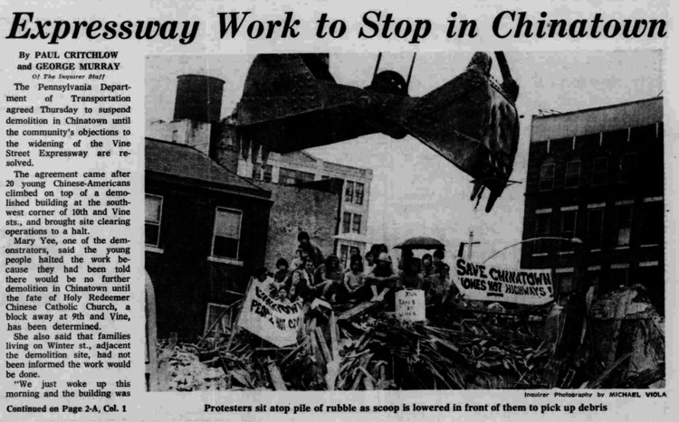 This intersection is another potent symbol of Chinatown's resistance and development in response to urban renewal. To the north of here, the depressed Vine Street Expressway, built in the 1980s after many delays resulting from community agitation, seemed to establish a firm northern border for Chinatown. However, the expressway we know today occupies a smaller footprint than the State of Pennsylvania, which built it, originally intended. The photo shown here depicts a 1973 occupation by activists of a demolition site at the intersection where you are now standing. Community activists helped force a redesign of the expressway so that it would be less intrusive, including the decorative noise barrier wall along the north side of Winter Street. A large mural at the southeast corner of this intersection now commemorates the resistance of these activists and others in the Chinatown community.