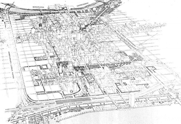 In 1945, the City Planning Commission proposed a depressed 6-lane expressway along the Vine Street corridor as part of the regional highway network. It would connect to the existing Ben Franklin Bridge and new expressways along the Schuylkill and Delaware rivers (now I-76 and I-95, respectively).
