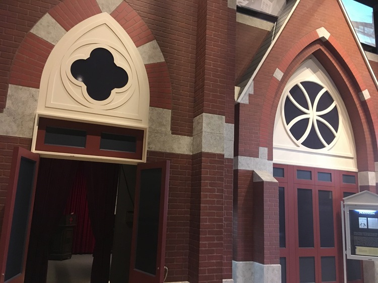 Devant vous se trouve une grande façade en brique avec deux arcs en ogive. Chaque arc a une fenêtre décorative avec des motifs de briques autour d’elle.