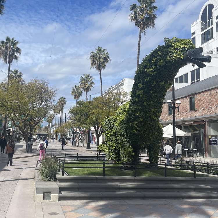 Let's first exploer the area between Broadway and Arizona. As we cross Broadway, our attention is immediately drawn to a dinosaur-shaped topiary that has been standing there since the early 1990s. In 2015, the city of Santa Monica announced plans to remove the topiary which sparked outrage among locals and visitors, who started a petition to save the topiary. In the end, the city agreed to keep the dinosaur topiary.