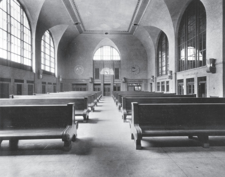 Accessible from the Waiting Room were the men's and women's restrooms, both of which were finished with beautiful tile; a commercial rental space that featured a circulating library, news stand and novelty shop; and the women's lounge area. The women’s lounge was designed to be as plush and patterned as the most opulent theaters in the world. Low-profile furniture provided comfortable seating, and decorative panels enhanced the space with patterns of red, gold, green, black and gray.