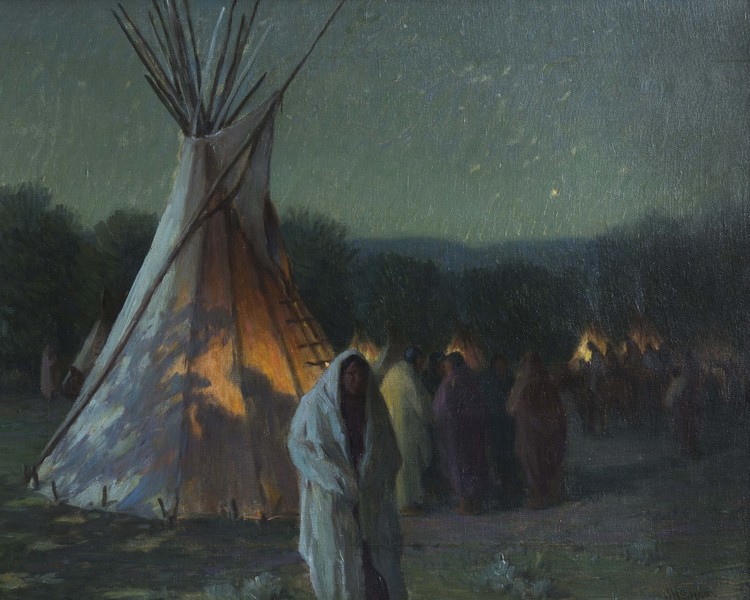 Joseph Henry Sharp was born in Bridgeport, Ohio, and traveled to the American West, living at the Crow Agency in Montana. His paintings in this exhibition entitled Winter 1904 Crow Reservation Montana (1904) and Moonlight & Firelight Crow Reservation Montana reinforced popular Euro-American romantic notions about the “vanishing race” and the noble Native Americans who had remained uninfluenced by mainstream culture. However, Sharp’s social awareness of both Plains and Pueblo cultures was astute since he had lived in Montana and Taos, New Mexico. In his writings, the artist described the United States government’s bureaucracy and the harsh reservation realities that included poverty and disease.