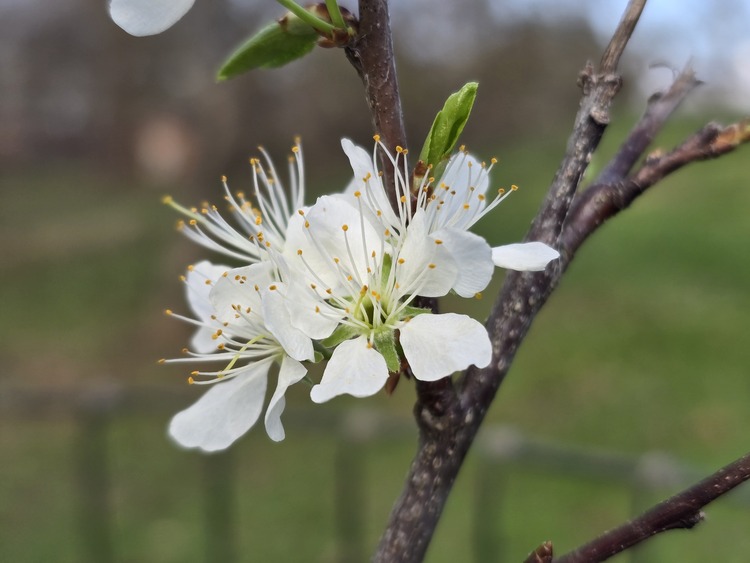 Here we have the American Plum, or the Prunus americana. Its clustered, whitish-pink flowers bloom in April and attract all sorts of pollinators. These trees are often found growing in small colonies, and they're commonly spotted on roadsides. Depending on who you ask, they can be considered a large shrub or a small tree. Mammals like raccoons, opossums, foxes, and coyotes enjoy the plums, which ripen around August and are about an inch in diameter. Songbirds use this tree for nesting, and prey species hide in their tangled branches. The leaves are very ovular and come to a point at the tip, with a well-defined vein pattern. As the tree matures, its bark becomes dark brown and thin, with scaly plates.