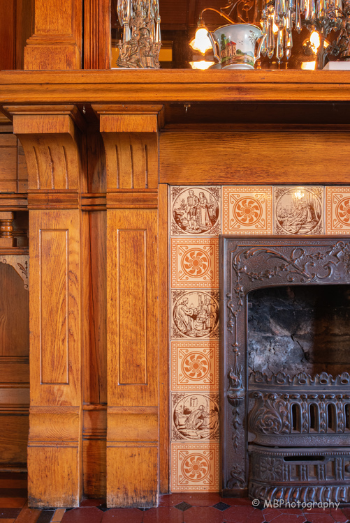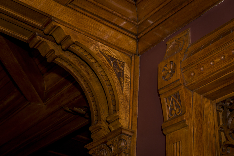 La carpintería de toda la casa es Roble blanco y es fantástico, fué tallada a mano por William Van Stratum.  Tenia diecinueve años cuando comenzó el trabajo y terminó cuando tenía veintidós años.  El tallado a mano era una característica del “Movimiento Estético” específicamente “Arte y Oficio.”  Ambos movimentos fueron contrapuntos a la superior decoración de los comienzos del diseño de la Era Victoriana (Renacimiento Gótico).