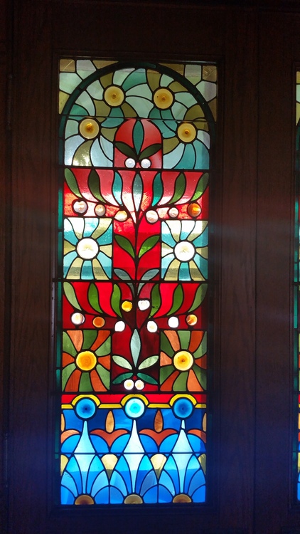 El vitral en las puertas son originales de la casa y producidas por Chicago Glass Company.  Hechas con el método La Farge quien producía colores  brillantes y vidrio opaco.  La Farge fue un artista famoso que trabajaba con óleos y vidrio. Fue un contemporáneo, colaborador temporal, rival temporal de Louis Tiffany.  Super funcional para ventilación cruzada y servían como entrada principal para los huéspedes que llegaban por el Rio.