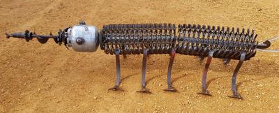 Adrian Smalberger. I got the idea of the Drillipede from the show dinotrux supercharged, is a very rare type of tool. I saw the piece for the body in my dad's scrapheap reminding me of these "cerium centipedes". I ended up doing 14 less legs than planned as this little genius got cold and tired. Second place, junior category.