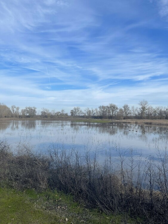 Ahead (east) are managed wetlands. These wetlands are flooded in late fall and continue to have water throughout the winter and early spring, providing roosting and foraging habitat for hundreds of waterfowl.