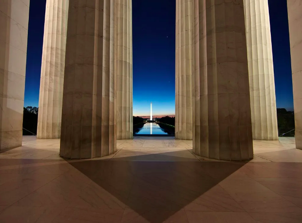 The Lincoln Memorial stands at the west end of the National Mall as a memorial to the 16th President of the United states. The memorial designed by Henry Bacon, after ancient Greek temples, stands 190 feet long 119 feet wide, and almost 100 feet high. It is surrounded by 36 fluted Doric style columns, one for each of the thirty six states in the Union at the time of Lincolns death in 1865.