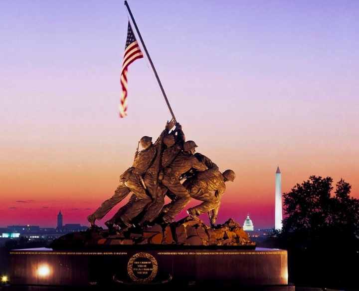 The U S Marine Corps Memorial, commonly known as the Iwo Jima Memorial, depicts one of the most famous events of World War II, but is dedicated to all Marines who have died defending the United States since 1775. The base of the memorial is inscribed with the statement, "Uncommon Valor was a Common Virtue."