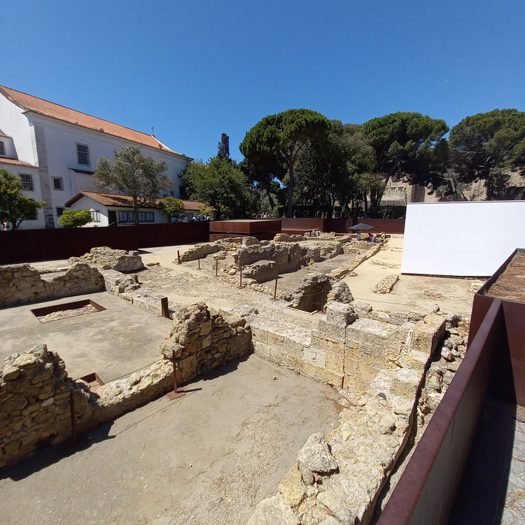 At the far end of this enclosed area, there are remnants of the walls of part of the ancient Royal Palace, which was destroyed by several earthquakes during the 16th century. It is believed that these buildings once harbored the Palace of the bishop of Lisbon, before being integrated into the Palace of the Counts of Santiago, which was also smashed by the big seism of 1755.