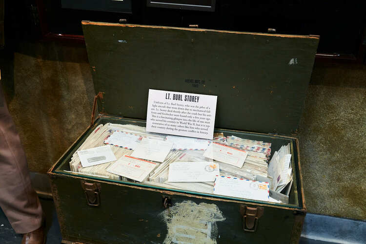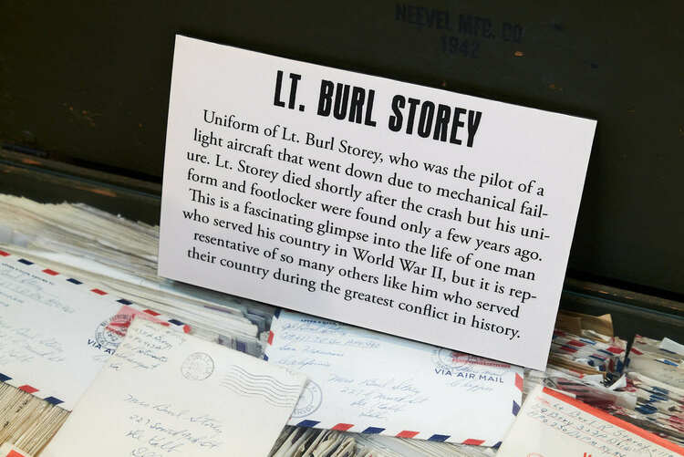 A Foot Locker purchased alongside the uniform contained more than 900 letters written by Burl to his wife, spanning from his enlistment in 1938 to his tragic death in 1944. Upon the opening of the Foot Locker, a letter postmarked the day of Burl's death was discovered, as if Lieutenant Storey was entrusting his legacy to those who would discover it. The exhibit features a meticulously curated collage that encapsulates Lieutenant Storey at different stages of his life.