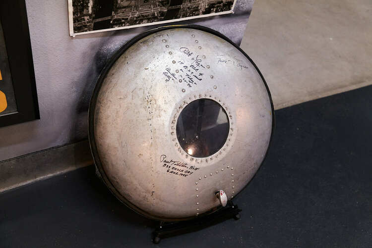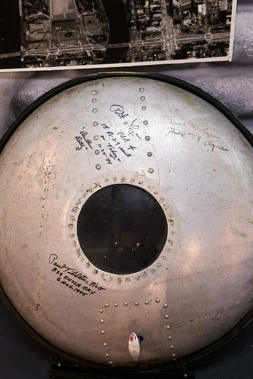 On display, we have a hatch cover from a B-29 bomber aircraft, identical to the iconic Enola Gay. This particular artifact has been autographed by several notable figures. The first, Robert Morgan, piloted the famous Memphis Bell during World War Two and also flew a plane known as the Dauntless Dotty, which led the first B-29 raid on Tokyo. The second signature is that of Paul Tibbets, the commander of the Enola Gay and the man responsible for dropping the atomic bomb on Hiroshima. One particularly fascinating signature on the hatch cover is quite small and might be overlooked. It belongs to Dr. Harold Agnew. Dr. Agnew wasn't a soldier but a scientist, specifically at Los Alamos, New Mexico, the hub of the Manhattan Project. He worked on developing the atomic bomb and flew in the plane trailing the Enola Gay during the fateful mission. His role was to measure the yield of the atomic bomb—a remarkable story of an unexpected visitor, indeed.