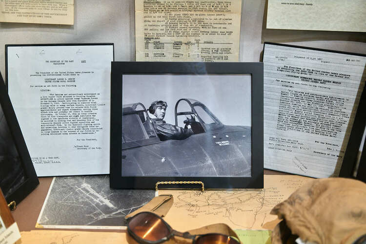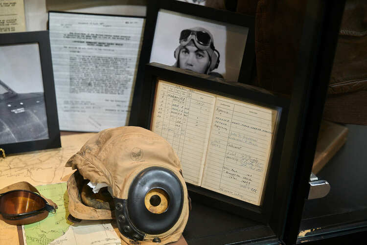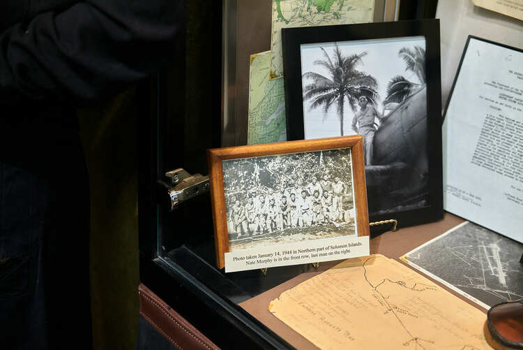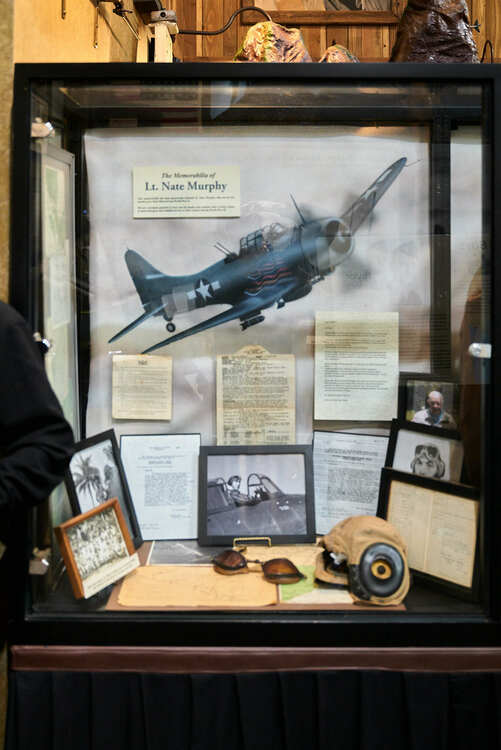 Lieutenant Nate Murphy, a veteran who generously bequeathed his war memorabilia to this collection. This display case allows us to explore his life and service, punctuated by a beautifully intricate drawing of his aircraft. The depiction of the aircraft he flew, created through the collective effort of eight sketches, imbues this object with a sense of vivid realism and a strong connection to the past.