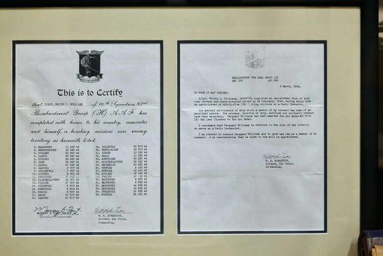 Melvin Williams, a native of San Diego, held the crucial role of a radio operator gunner on a B-24 during World War II. Williams' military career is characterized by his courage and perseverance, as he successfully completed 35 missions. His achievement stands as a testament to his resilience and determination, particularly when viewed against the backdrop of low survival rates during the war. Included in this exhibit are Williams' handwritten notes which recount each of his missions. These pages offer an unfiltered and intimate look into the realities of war. They range from what are described as 'milk runs', the military jargon for seemingly straightforward missions, to deeply affecting accounts of battlefield casualties. These notes provide a sobering and personal perspective on war, laying bare its stark realities. Melvin Williams' story is more than just compelling, it's a tangible testament to the trials and tribulations of a very young airman who served during a critical period in history. Williams was not just flying; he was part of a concerted effort to disrupt Germany's war machine during the closing stages of World War II. His series of missions spanned from September 1944 right through to February of the following year, a period marked by some of the fiercest aerial combat of the entire war. This exhibit offers a unique opportunity to explore that moment in history through the eyes of an individual who was there, in the thick of it, witnessing and shaping the course of events.