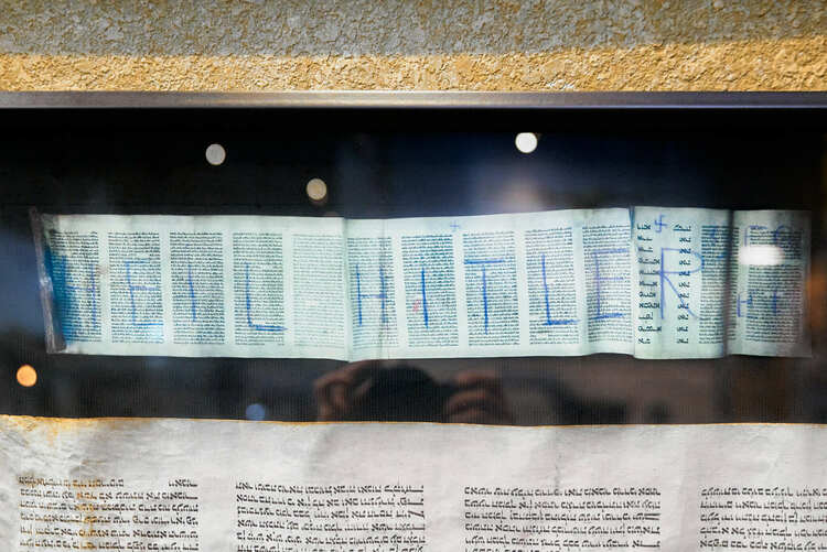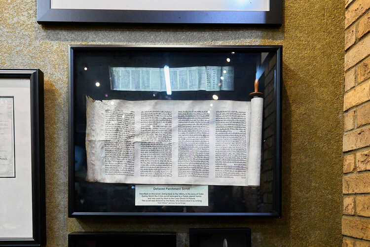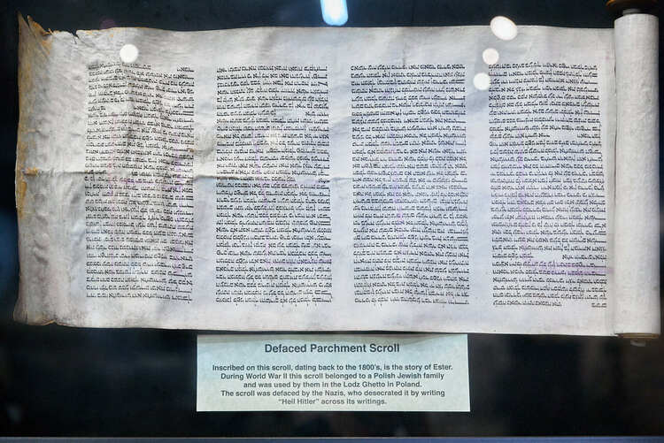 Next to the photograph, a defaced parchment scroll narrates the story of Esther, defiled by the Nazis with the chilling words "Heil Hitler." Despite the prominent propaganda, a scanned version of the document before framing allows visitors to appreciate its original contents.