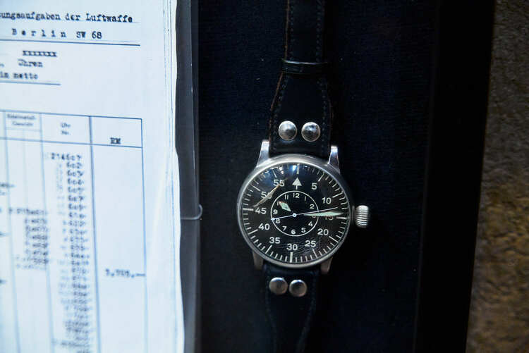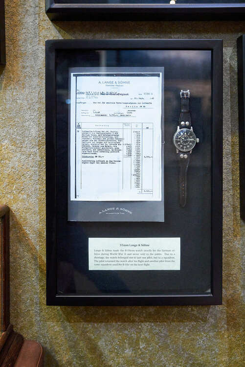 A pilot's chronograph, typically gifted to Luftwaffe squadron leaders of World War II, can be found below the aforementioned scroll. Surviving leaders would pass this watch to their successors. Interestingly, this timepiece was manufactured by A. Lange & Söhne, who also made a personal watch now present in the exhibit. The back of the watch carries markings that allowed a tracing of the watch's delivery to the Luftwaffe, dated 22nd September 1943.