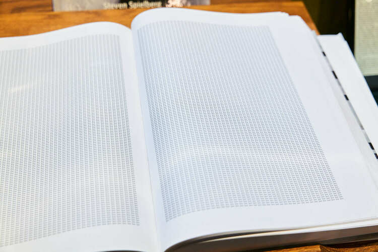 A profound testament to the enormity of the Holocaust can be found ontop a small glass case – a book titled, "Everyone is Someone". This book contains one single word, "Jew", repeated six million times over 1,250 pages. A potent visual representation, it conveys the staggering number of lives lost, each word representing a person, a family, a village - a tangible, powerful reminder of the devastating scale of the Holocaust.
