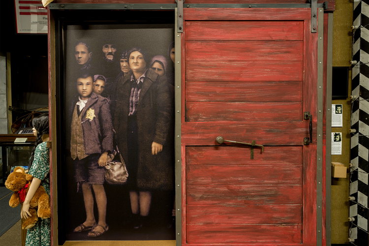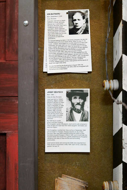 At the heart of this exhibit stands a boxcar, painstakingly created to mirror those the Nazis employed to transport Jews to concentration camps during the Holocaust. This grim relic is designed to hold up to 40 individuals; however, historical records inform us that Nazis would commonly force upwards of 300 or even 400 terrified individuals into such a confined space, providing little to no sanitation or ventilation. Each person in this ordeal had a story, a life, a name - they were someone. To honor these individuals, portraits were commissioned, each one rooted in extensive research and resources from our synagogue and beyond. These biographies can be found within a small box accompanying the display.