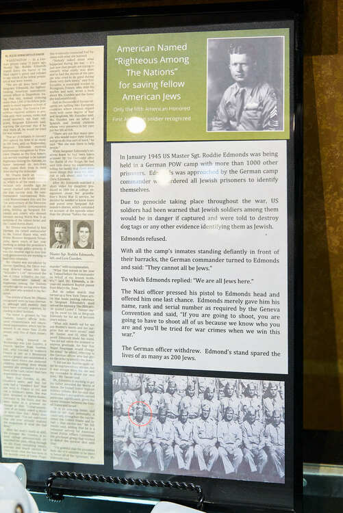 Roddie Edmonds, an American soldier and a righteous Christian, is remembered in an obituary on display here. Despite being a sergeant in a Nazi concentration camp at the war's end, he rose to a leadership role due to the deaths of all higher-ranking officers. When tasked by the commandant to gather Jewish prisoners, Edmonds resisted, declaring that all prisoners were Jews. His courageous act saved the lives of 252 Jews, earning him a place among the Righteous Among the Nations in Israel, decades after his passing.