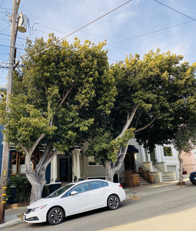 Head North across Parnassus Avenue and turn right, heading uphill. Continue to the two large trees at 58 Parnassus, and try crushing a leaf from the suckers shooting up at the base of the trees. The distinctive smell will identify them as bay laurel trees from the Mediterranean region, sometimes called Grecian bay trees. The scientific name is Laurus nobilis. This is not our local California bay tree, it’s the culinary bay that is used in Mediterranean cooking.