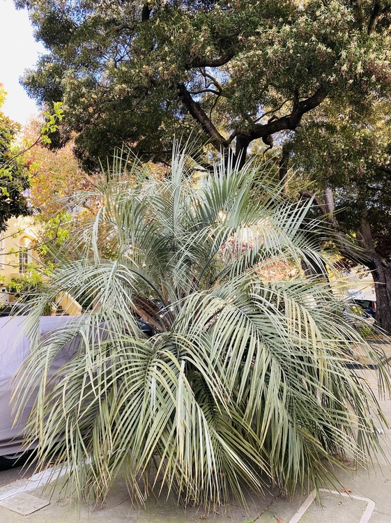 At 431 Belvedere you’ll find a pindo palm – the scientific name is Butia odorata – native to Southern Brazil and Uruguay. This tree was only planted in 2010, but it is already demonstrating the characteristic blue-gray, graceful fronds of the species, which curve in toward the trunk. Pindo palms are rare as street trees in San Francisco, and this is the only one in the neighborhood.
