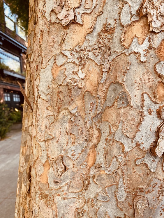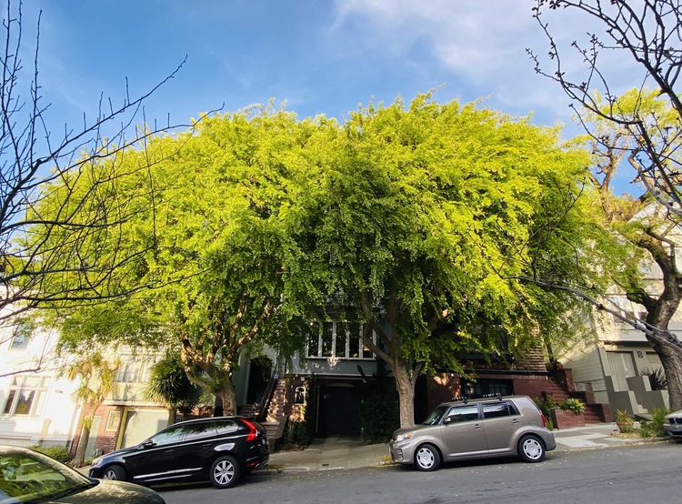 At 466 Belvedere are two Chinese elms from East Asia – the scientific name is Ulmus parvifolia. Of the 35 different species of elms, the Chinese elm is by far the most common in San Francisco, and the two at this address have been lovingly cared for by the owner. Chinese elms are noted for their beautiful bark, which comes off in puzzle-piece shapes. Just next door at 472 Belvedere is another elm - this one is a European elm, but I’m not sure of the species – European elms are very hard to tell apart, and they also hybridize with one another, which makes them even harder to identify.
