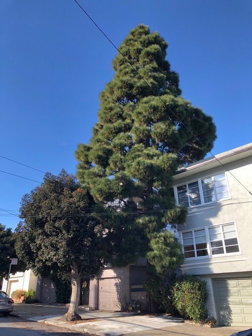 4810 17th Street -The very tall pine tree between the two buildings at this address is a Canary Island pine tree, native to the Canary Islands off the coast of Africa. The scientific name is Pinus canariensis. Also planted in a sidewalk cut at this address is a red flowering gum from southwest Australia – the scientific name is Corymbia ficifolia. Despite its name, the flowers of this tree can bloom red, orange, pink or white (or various shades in between). This particular tree has spectacular orange flowers when it blooms in August each year.